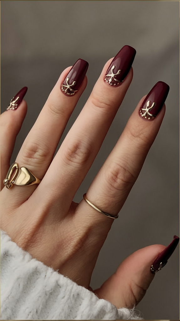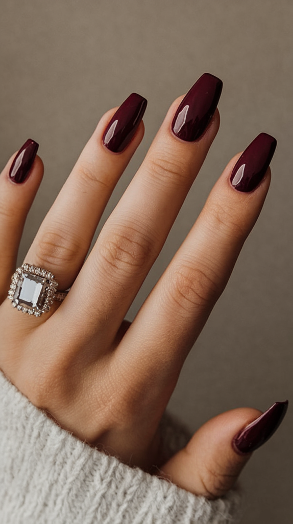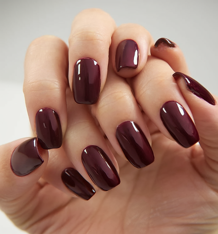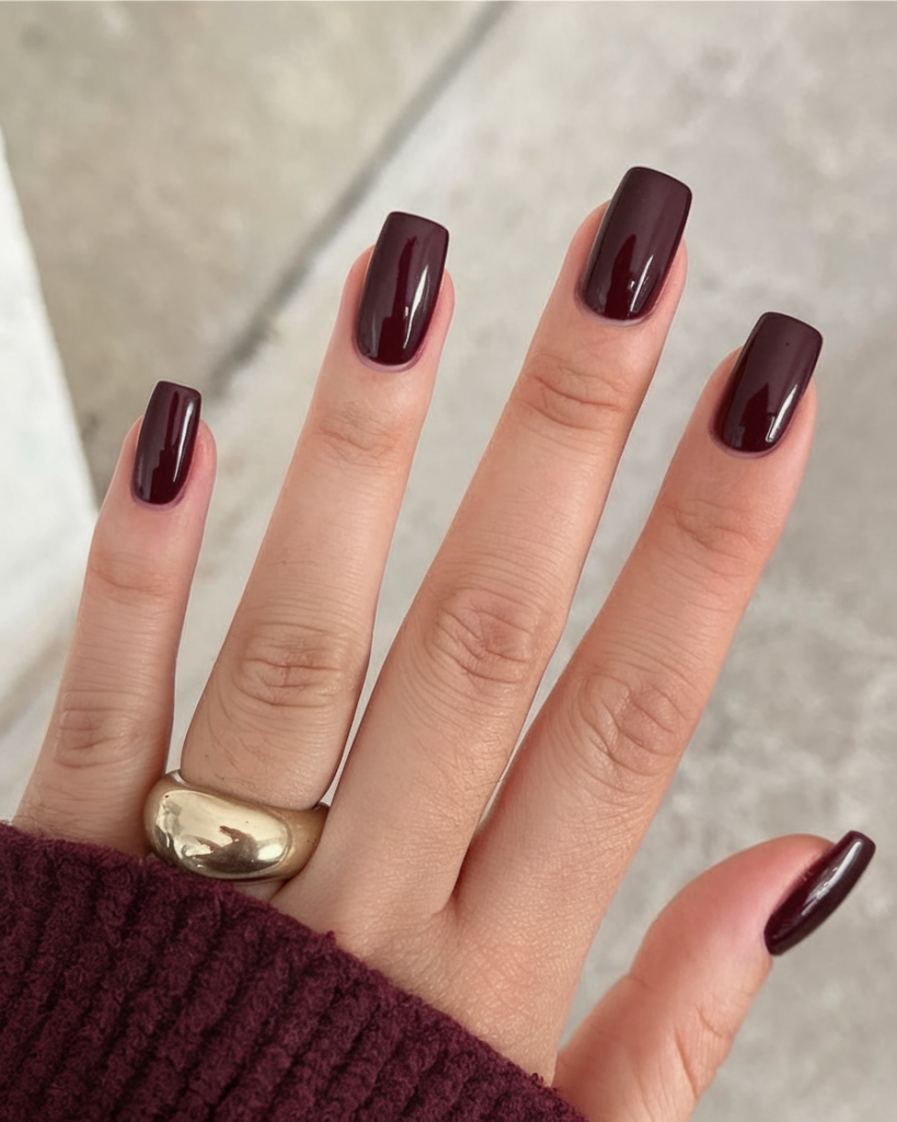 Clean, crisp, and timeless. This square-shaped burgundy manicure is all about polish — literally. The high gloss finish exudes modern elegance, making this look a go-to for professionals and minimalists alike. It pairs beautifully with a wool blazer, silver jewelry, and classic winter hues like charcoal and cream.