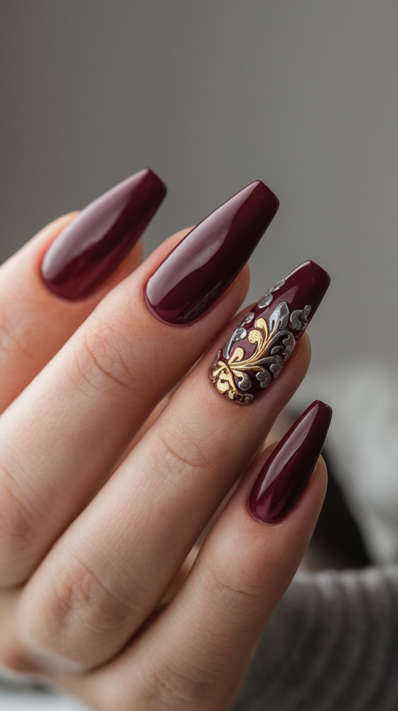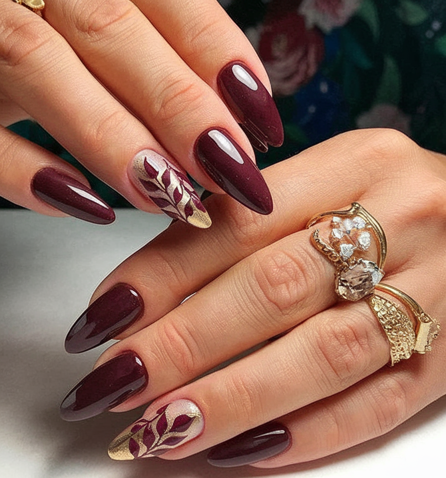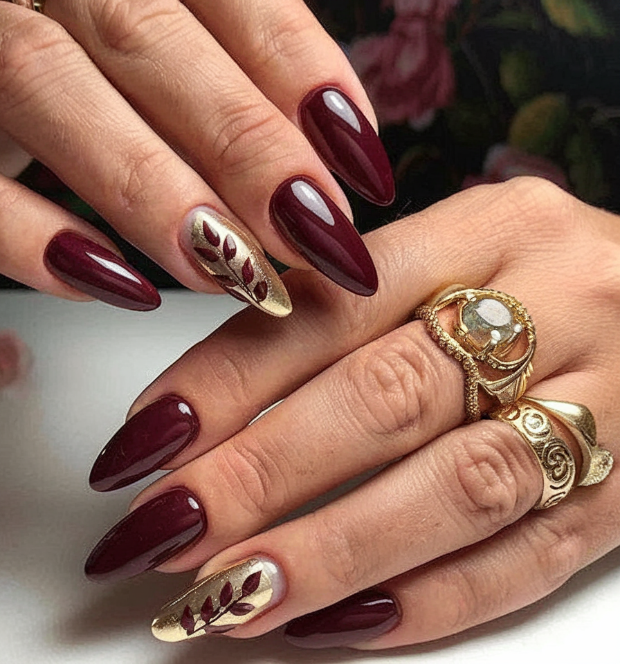 Last but not least, we’re going full glam. These elongated, oval nails showcase intricate nail art — golden foil leaves over a soft champagne base, paired with rich burgundy. It’s nature meets couture. These designs with gold are perfect for upscale events or festive seasons.