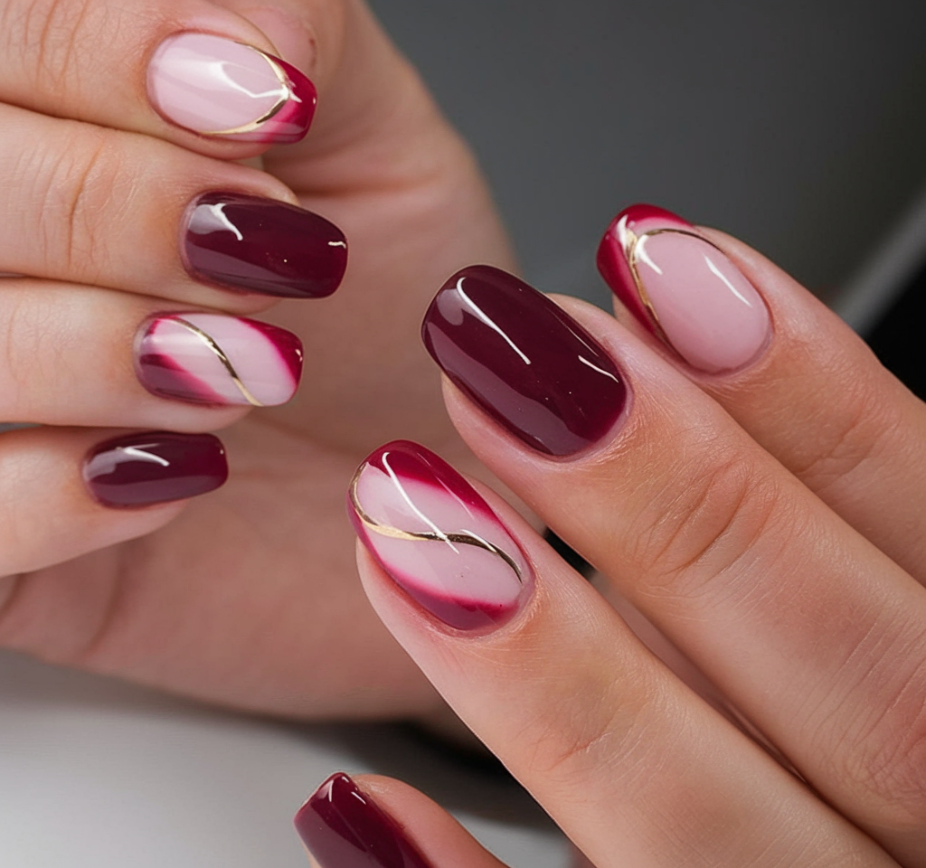 Modern, fresh, and playful — this squoval manicure uses burgundy and blush pink in layered waves, outlined with a thin golden stripe. The color blocking feels very 2025: it’s clean but experimental, polished but fun.