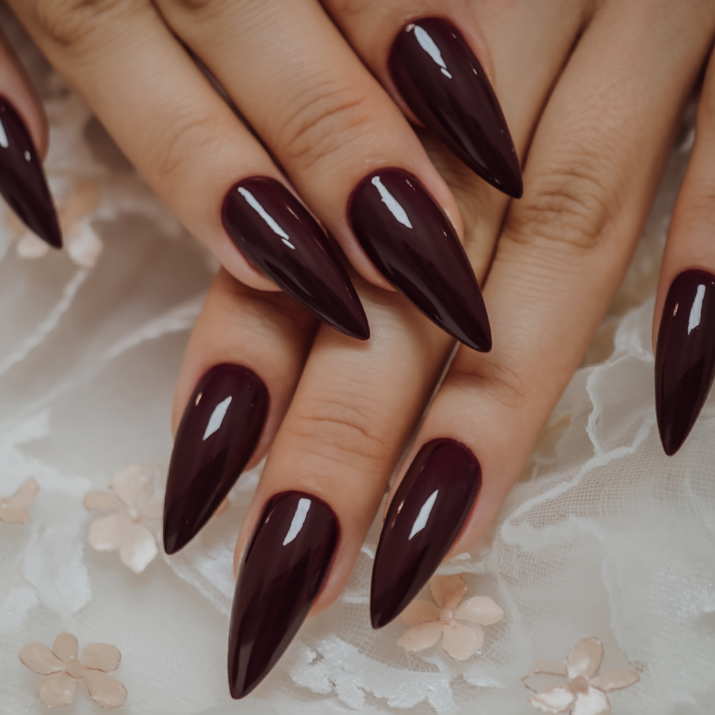 Welcome to the power of the almond shape — the ultimate in feminine elegance. This burgundy tone, with its dark red undertone, is sultry and polished. Perfect for date nights or elevated casual days. Add dainty rings and soft fabrics like satin or silk to bring out its romantic appeal.