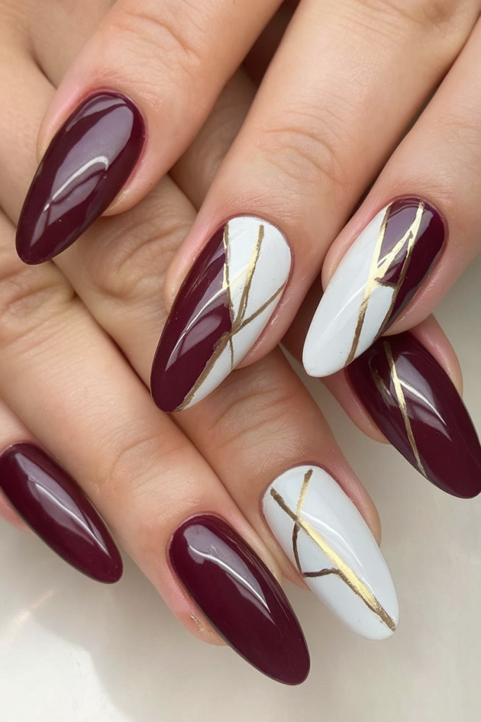 This set is all about contrast. White nails with gold linear accents cross over half-burgundy designs in a stunning blend of clean geometry and classic opulence. The almond shape keeps it refined, while the palette gives you something crisp and modern.