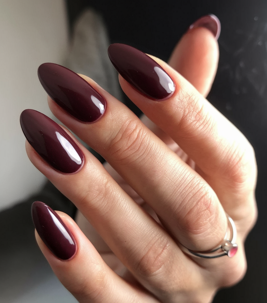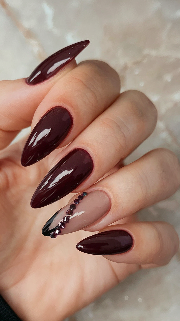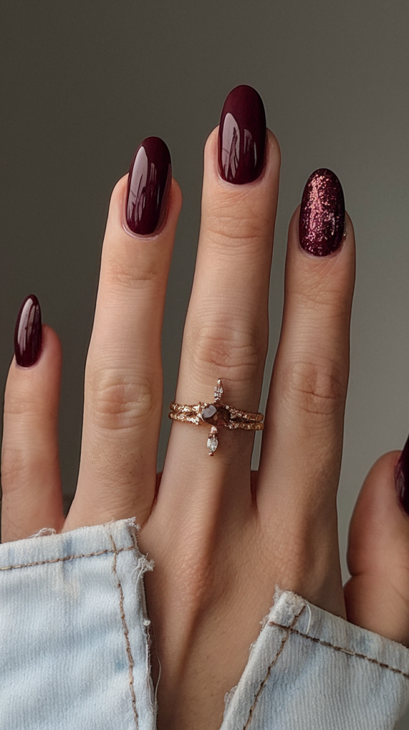 Sometimes, all you need is one finger to make a statement. The glitter accent on the ring finger is everything — adding just enough sparkle to transform this almond burgundy mani into a celebration-ready look.