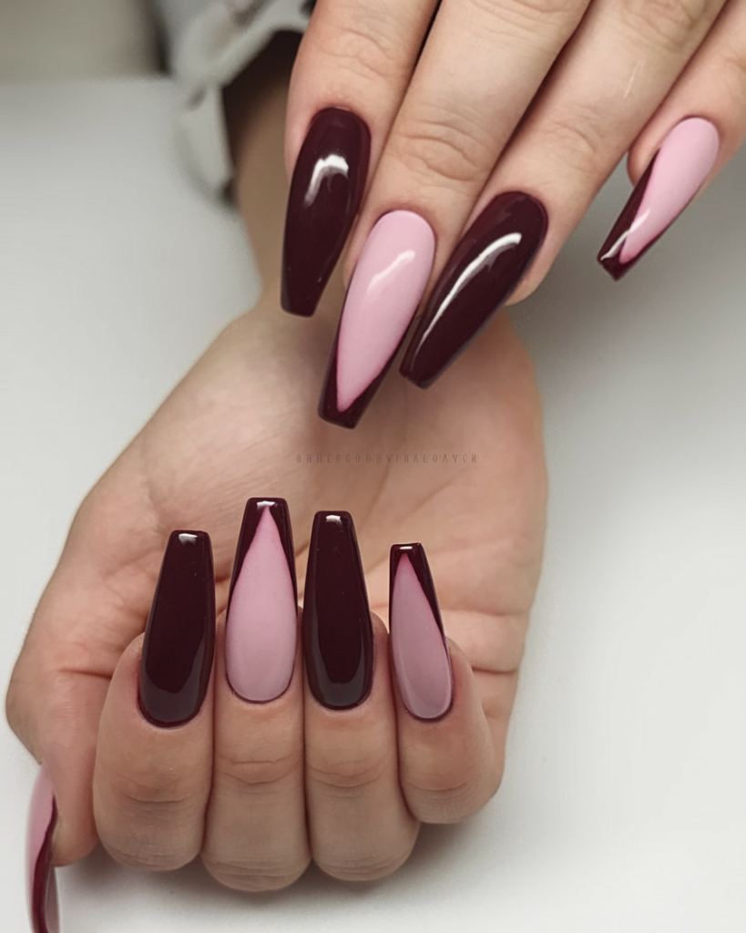 This design is for the woman who loves drama with balance. The extra-long coffin shape (a twist on square nails) blends rich burgundy and bubblegum pink in swooping, bold waves. Think Barbiecore meets Bordeaux — bold, stylish, and unapologetically fun.