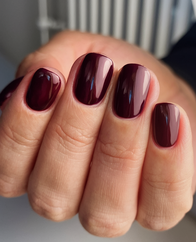 Ending on a high note — these compact, short, and rounded burgundy nails are pure minimalist heaven. The shape is soft, the finish is a high gloss, and the tone is that perfect deep wine-red that looks equally luxe against black, beige, or denim.