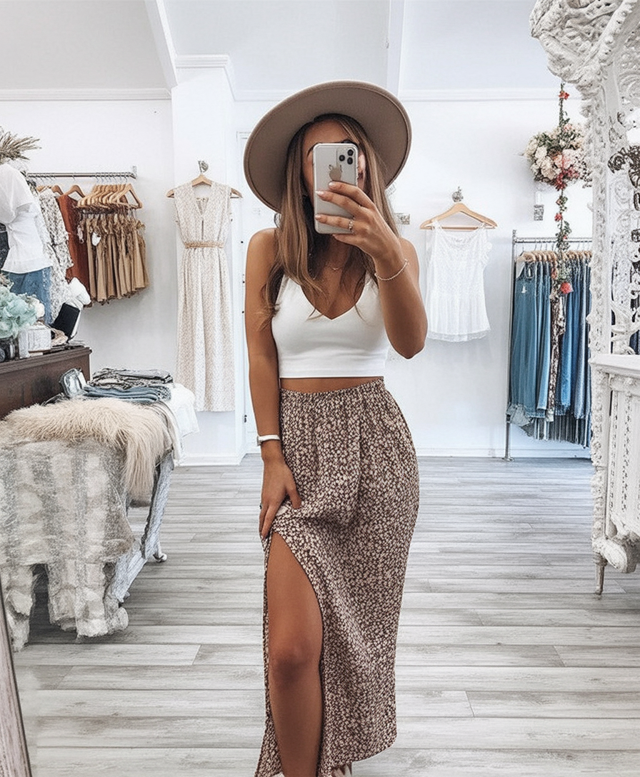 2. Boho Hat + White Tank + Flowy Floral Midi Skirt