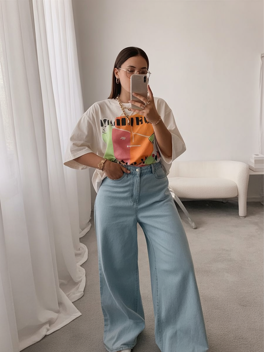 6. Graphic Tee + Wide-Leg Jeans + Gold Accessories