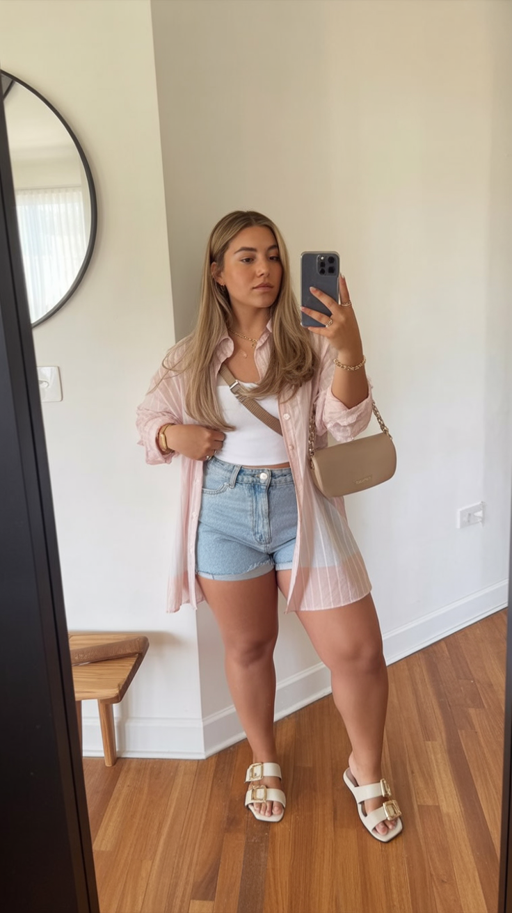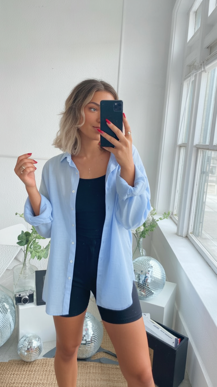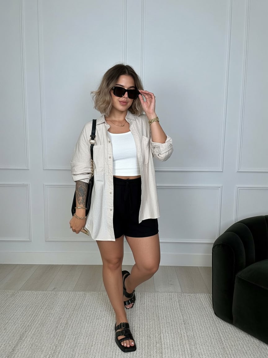 Compared to a basic tee-and-shorts look, the oversized button-down makes everything feel more classy and intentional. It adds shape, coverage, and that effortless “I styled this” vibe, even if you threw it on in two minutes. Keep accessories minimal and let the color do the work. This is easy inspo when you want cute but not fussy.