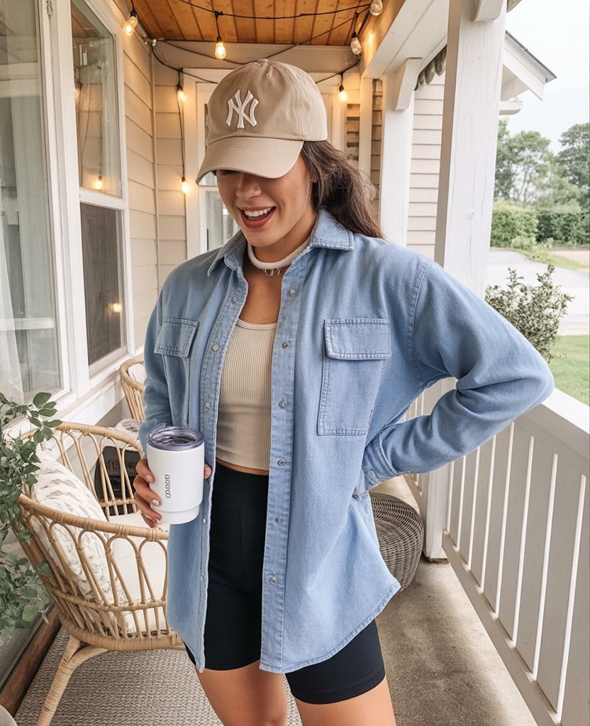 14. Chambray Shirt + Bike Shorts + Baseball Cap