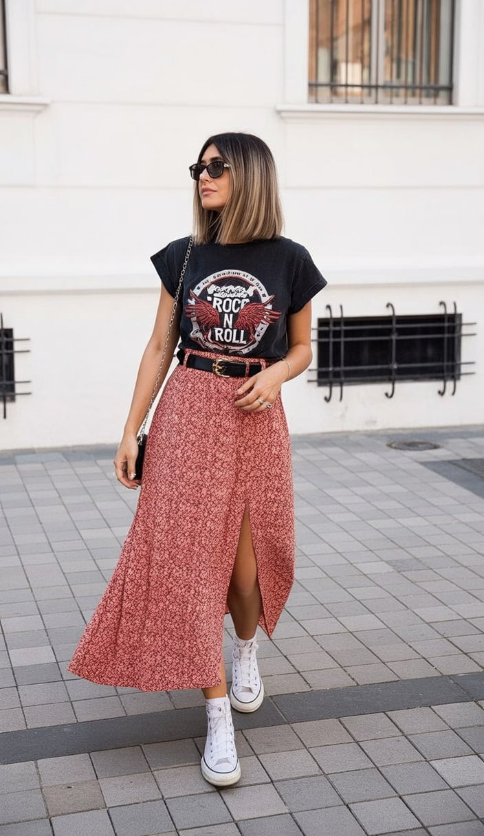 This outfit is that perfect sweet-meets-edgy mix. The band tee adds attitude, the printed maxi skirt brings softness and movement, and the sneakers keep it grounded and cool. It’s the kind of street style look that gets compliments because it looks creative, but it’s still comfortable enough to actually live in.