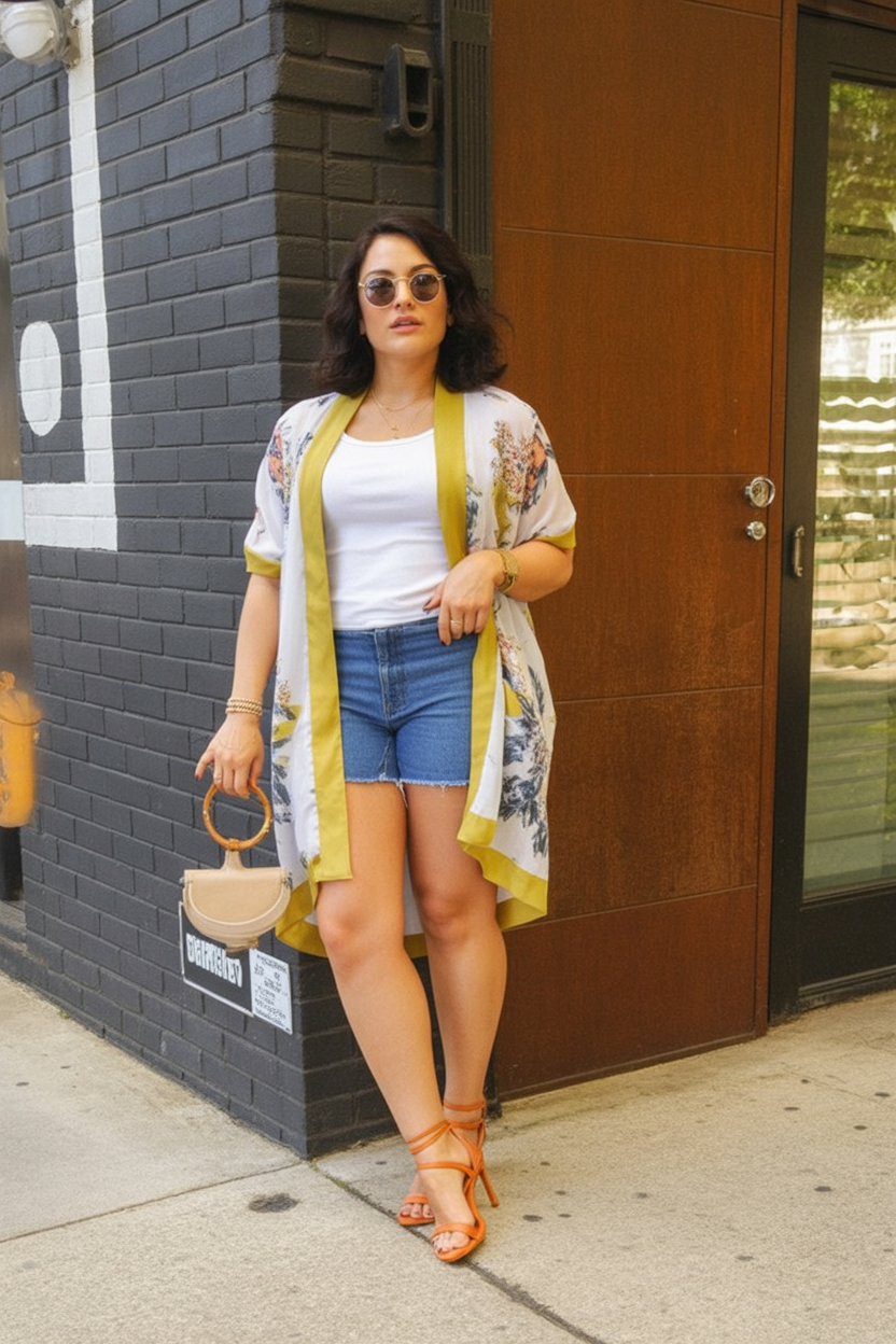 What to wear it with: keep the base simple (white tank, denim shorts, neutral bag) so the print stays the star. This is especially flattering for midsize women because the kimono creates an easy drape without clinging. If you want it more for work, swap shorts for cropped jeans and choose a lighter sandal or low wedge. Add sunglasses, and you’ve got instant chic.