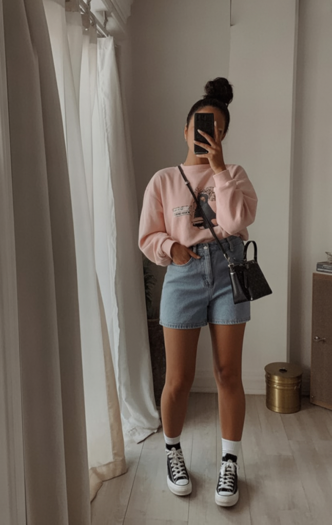 1. Pastel Sweatshirt + Denim Shorts + Classic Sneakers