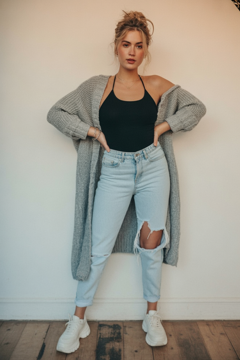 10. Long Cardigan + Bodysuit + Light-Wash Jeans + Crisp Sneakers