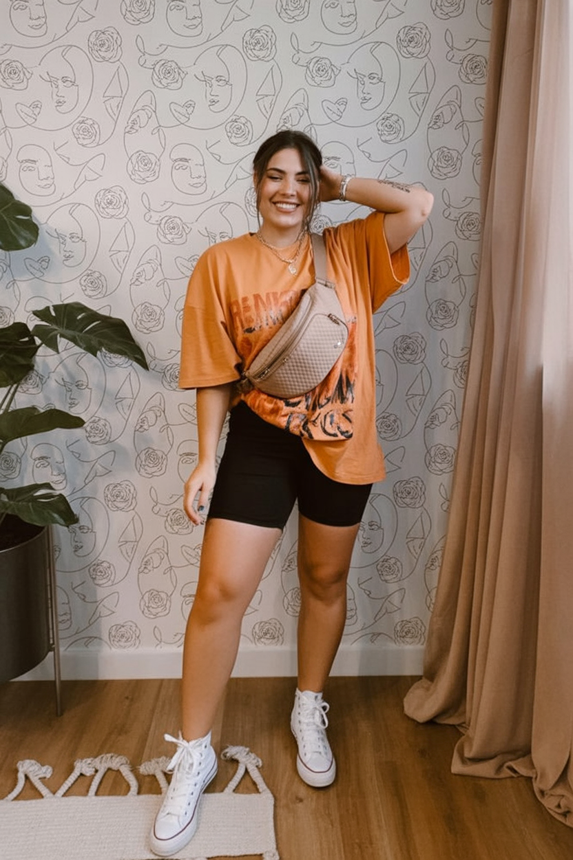 This look is pure “cool girl on a busy day.” The oversized tee gives you that relaxed confidence, while the fitted shorts keep it sleek and modern. The belt bag adds a little streetwear attitude, and the sneakers make the whole thing feel ready for real life—walks, coffee runs, quick errands, and those days when you want comfy but still cute.
