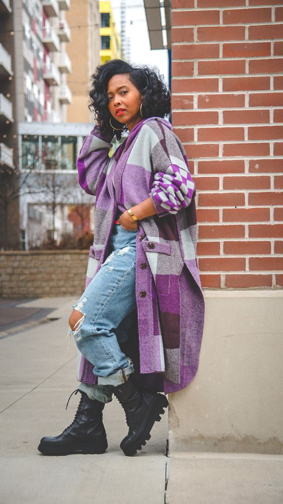 A vividly patterned long coat paired with distressed jeans serves as a testament to the bold and adventurous. This outfit not only stands out due to its color and pattern but also offers practicality for unpredictable fall weather. It’s an ideal choice for making a statement while keeping cozy, suitable for both city life and country escapades.