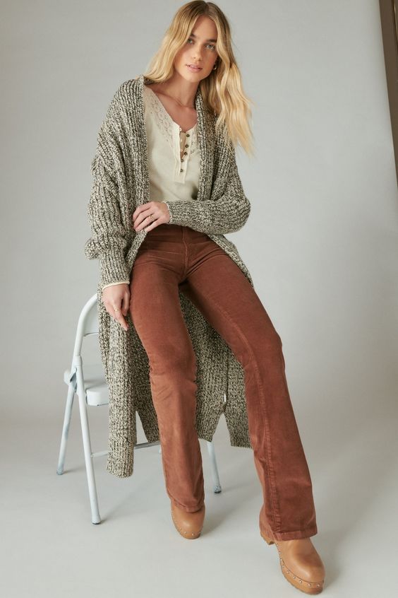 A superbly styled outfit for a cool fall day features a thick, textured cardigan layered over a delicate cream blouse, paired with rust-colored jeans. The ensemble combines textures and colors that echo the earthy tones of autumn, ideal for a relaxed yet fashionable outing. The cardigan’s chunky knit offers warmth, while the soft blouse underneath adds a touch of femininity. Rounded off with tan clogs, this outfit is perfect for an afternoon coffee date or a casual day at the office.