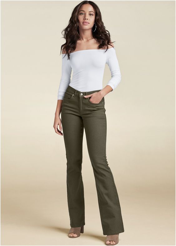 This outfit showcases the sleek simplicity of a white off-shoulder top paired with olive green jeans, perfect for a seamless transition from summer to fall. The combination of a snug top and softly flared jeans offers a flattering silhouette for all body types, making it an excellent choice for a day of shopping or a casual lunch. Pair with open-toe heels to add a touch of sophistication.