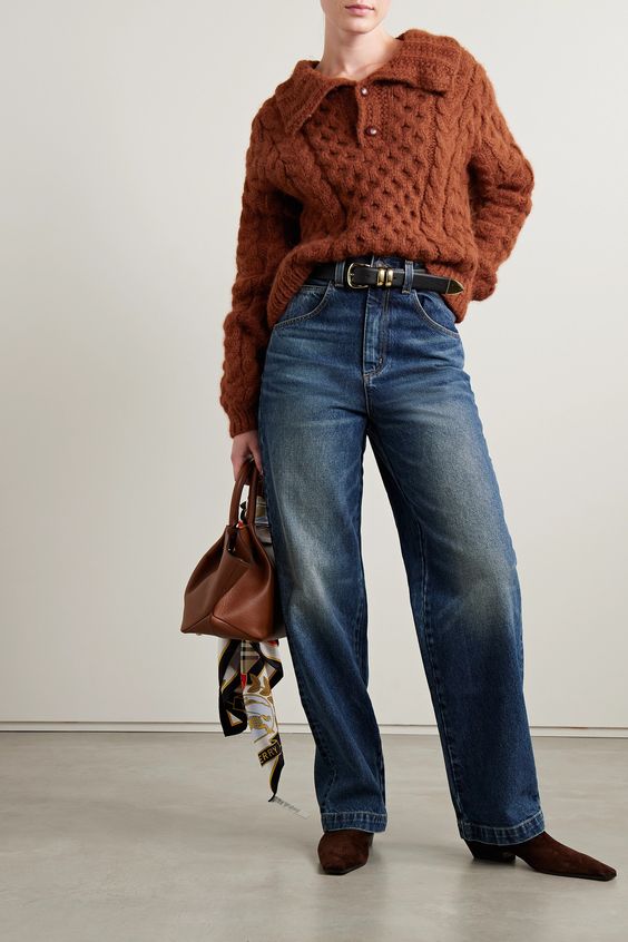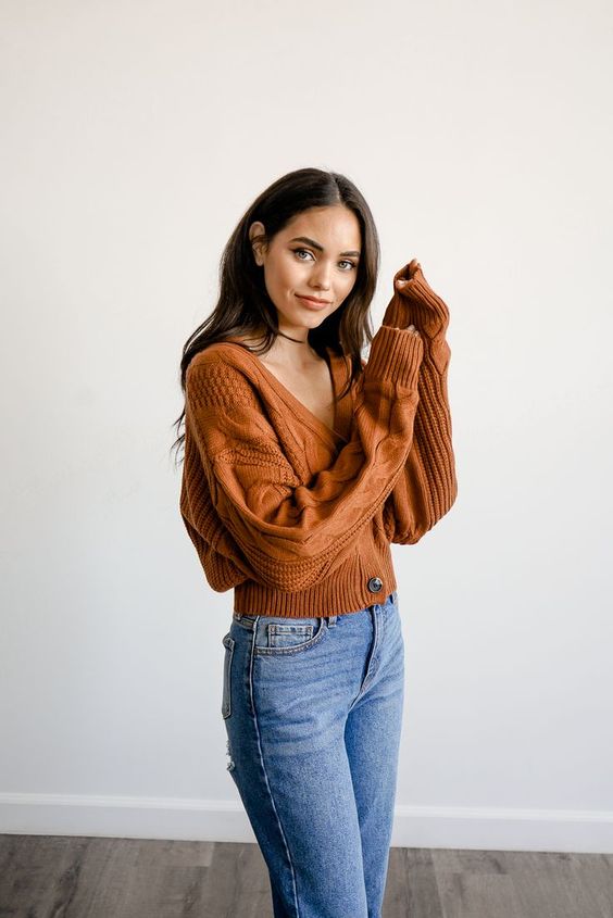 Fall is all about warm tones, and this outfit hits the mark with a deep rust-colored sweater. The wide neckline and detailed knit pattern provide both comfort and style, perfectly paired with light blue jeans for a pop of contrast. This look is ideal for those chilly days, offering a cozy yet stylish option that works well for both indoor gatherings and outdoor activities.