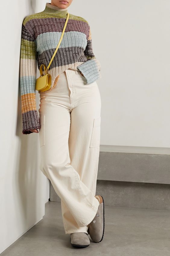 This ensemble features a high-neck multicolored striped sweater tucked into cream cargo jeans, blending bold colors with a relaxed fit. The sweater’s vibrant hues and the subtle utility of the jeans create a dynamic and youthful look, suitable for adventurous spirits looking to make a statement during the fall season. This outfit is complemented by simple slip-on shoes, emphasizing comfort without compromising on style.