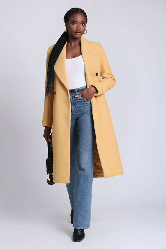 This elegant ensemble features a striking yellow overcoat that brightens any dreary fall day, paired with simple yet chic blue jeans. The coat’s clean lines and vibrant color make it a focal point, suitable for a powerful office look or an evening out. Its tailored fit complements the relaxed jeans, creating a balanced and stylish outfit.