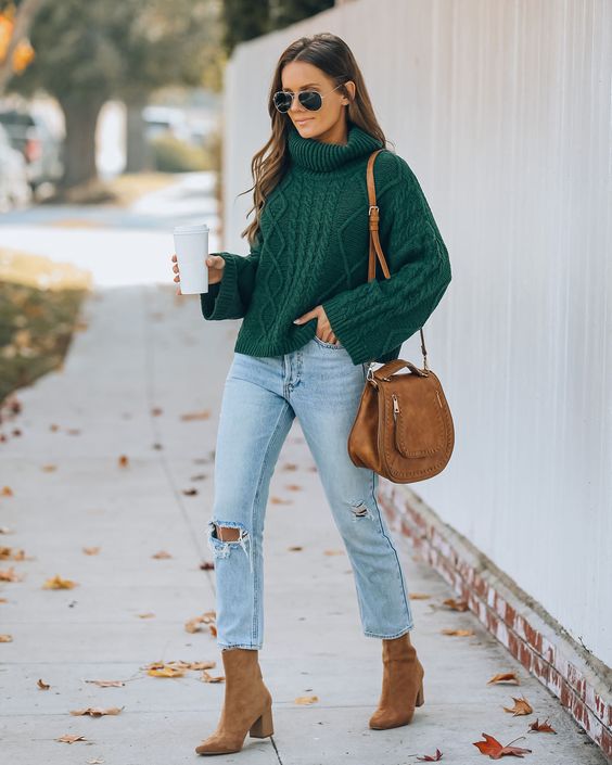 As temperatures drop, a chunky green sweater paired with ripped jeans offers both warmth and style. This outfit is perfect for fall outings, combining the earthy tones of the sweater with the ruggedness of light-washed denim. The look is completed with suede boots and a simple crossbody bag, emphasizing comfort without sacrificing style.