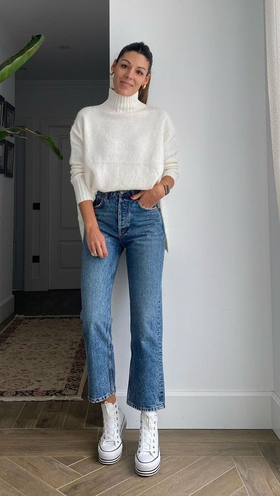 Breaking the mold, this outfit features a pristine white turtleneck with cropped jeans, challenging the traditional dark hues of fall. This refreshing look is ideal for those sunny yet chilly fall mornings. Paired with classic high-top sneakers, it offers a youthful and vibrant vibe, perfect for a casual day out or a comfortable gathering with friends.