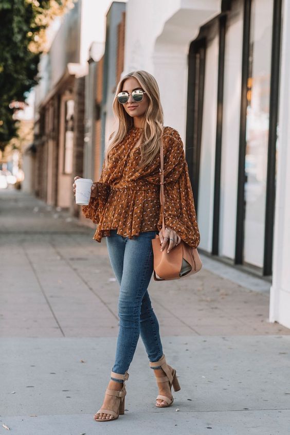 Embrace the bohemian rhapsody with a patterned, flowy blouse and slim-fit jeans. This outfit is a nod to the free-spirited fashionista, blending rustic prints with the sleek silhouette of skinny jeans. The earthy tones of the blouse paired with open-toe heels make it a standout ensemble for both indoor gatherings and outdoor escapades.