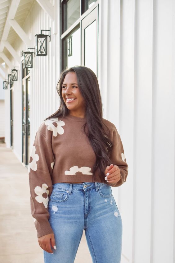 A light brown sweater adorned with bold floral patterns offers a unique twist on fall fashion. Paired with classic jeans, it strikes the perfect balance between casual and chic. This outfit is particularly appealing for a relaxed weekend brunch or a stroll through the city, providing both comfort and a touch of personality.