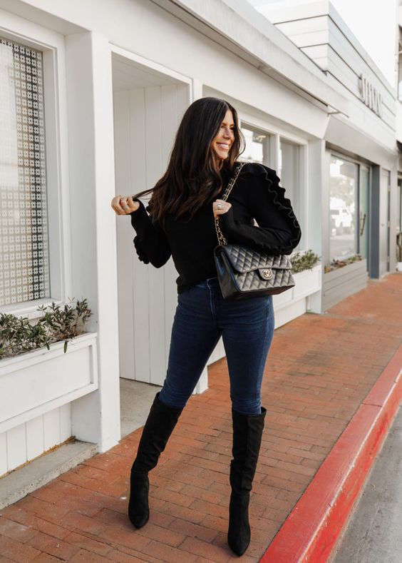 For those who favor a sleeker look, a black ruffled sweater paired with dark jeans is a quintessential choice. This combination is both flattering and versatile, suitable for office hours or evening events. The elegance of the outfit is enhanced by knee-high suede boots, making it a go-to for stylish yet busy women.