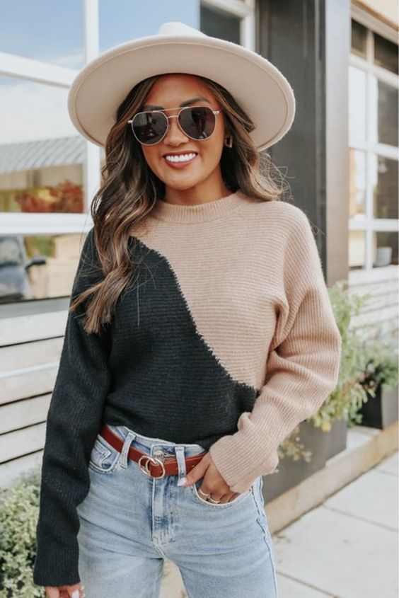 This two-tone knit sweater blends seamlessly with light denim jeans, offering a modern twist on traditional fall colors. The split design of the sweater injects a contemporary edge, perfect for the fashion-forward woman. This look is effortlessly chic and can be dressed up with accessories for a day out or kept simple for casual wear.