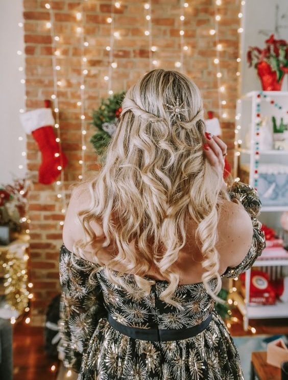 For those with long hair or medium hair, this romantic half up, half down hairstyle is both elegant and festive. Soft waves cascade down, while the top section is neatly pulled back and secured with a decorative hairpin. The loose curls add volume and texture, giving off an ethereal look that’s perfect for a cozy Christmas dinner or family gathering.