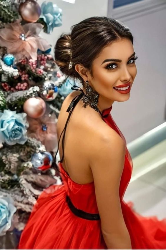 This look pairs beautifully with bold makeup, like a red lip and winged eyeliner, making it the perfect option for cocktail events or sophisticated holiday soirees.