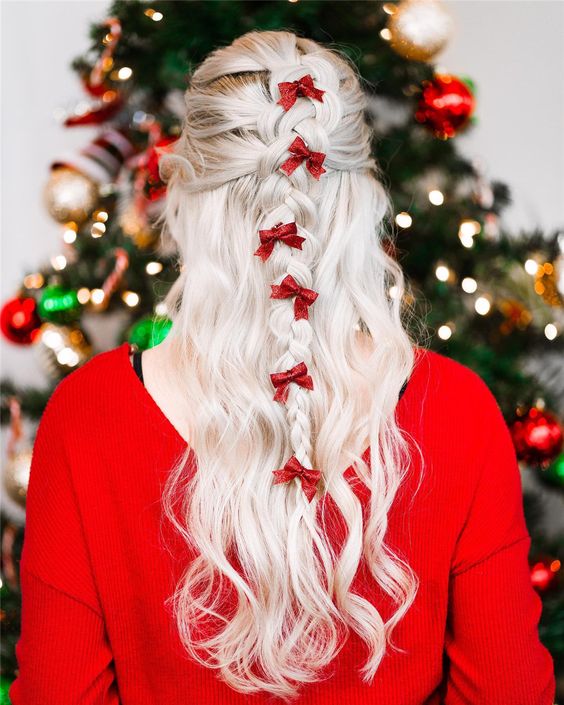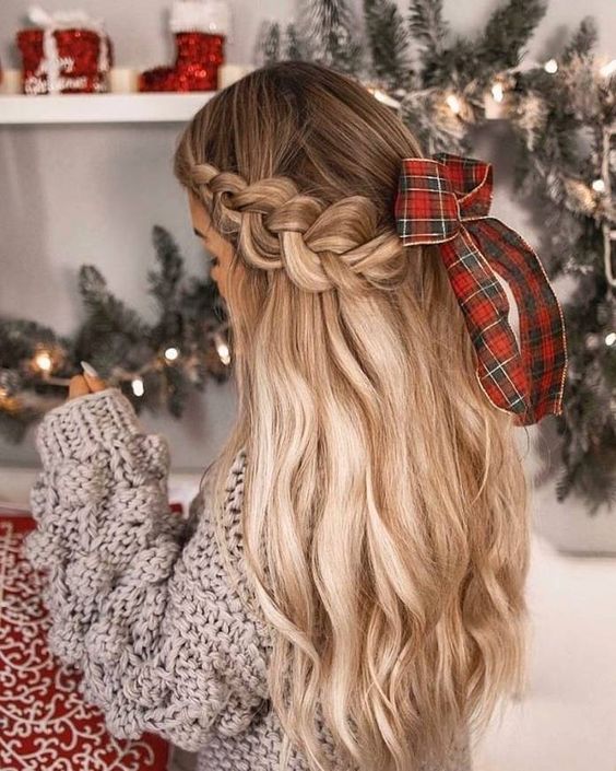 This style is simple to create: braid a section of your hair and weave the ribbon through for added festivity. The ribbon gives the look a cozy, holiday feel, perfect for any Christmas activity.