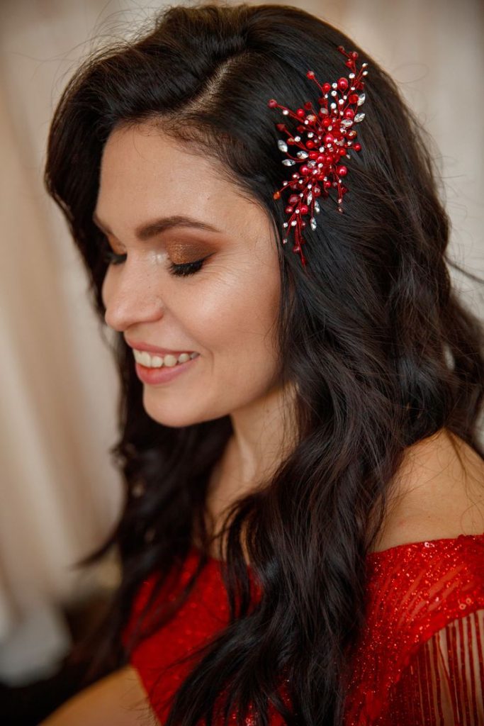 This sleek and polished hairstyle is perfect for those who prefer a more minimalist look with a festive twist. Featuring a stunning red, berry-shaped hair clip, this style keeps the focus on the accessory while allowing natural waves to cascade elegantly. It’s an easy look to achieve for medium length or long hair, giving you a touch of festive glam without going overboard.