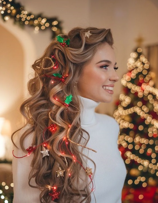 For a hairstyle that truly captures the festive spirit, twinkling Christmas lights woven through long curls is a standout choice. This style features cascading curls adorned with mini LED lights, glittery stars, and holiday-themed decorations. Perfect for long hair, this look radiates holiday cheer with every movement, making it ideal for a festive family gathering or a glamorous Christmas party.