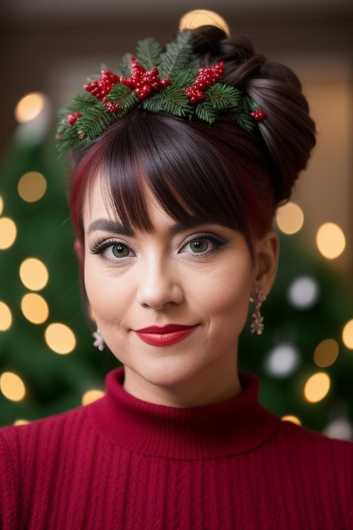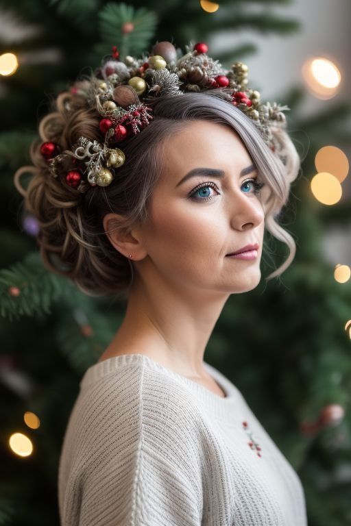 For a royal holiday look, this updo is a showstopper. The intricately twisted bun is adorned with Christmas-themed accessories such as tiny ornaments, pinecones, and foliage, creating a regal, festive crown. This style is ideal for medium length to long hair, but you can also use hair extensions to create the desired volume.