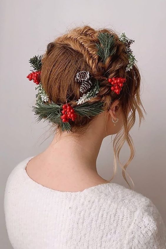To achieve this look, section the hair into small parts and carefully pin them in a circular formation at the crown of your head. The natural decorations add a magical, seasonal touch, perfect for office parties or formal Christmas dinners. This updo doesn’t just look stunning, but it also keeps your hair off your face, ensuring all-day comfort while you celebrate.