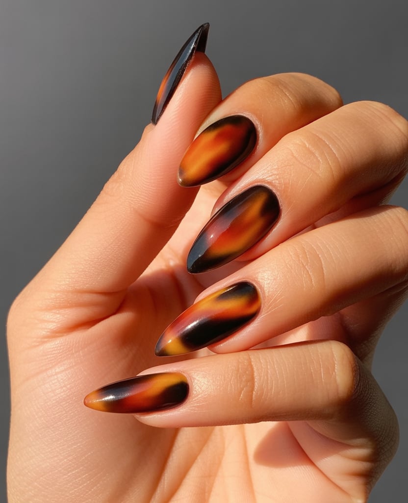 Glimmering tortoiseshell patterns with amber, espresso, and honey swirled together look like vintage sunglasses and are a feast for the eyes as depth is created through soft blurred layers. The look is sophisticated without any glitter, and the almond shape of the nails adds to the classically feminine silhouette, which is elongated, timeless, and flattering to all skin tones and all wardrobes.