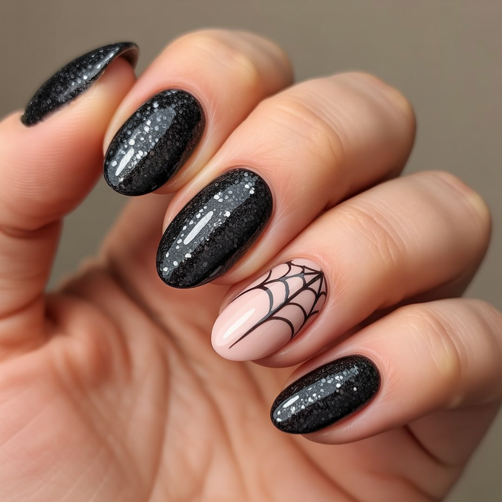 Midnight sparkle on most nails and a single web line on blush nude—this is moody, elegant glamour with personality. The contrast feels cinematic yet restrained, giving you a chic nod to art without going full costume. On a softly rounded almond, the silhouette stays refined, and the micro-glitter twinkles like city lights after dark. It’s equal parts cool and classy.