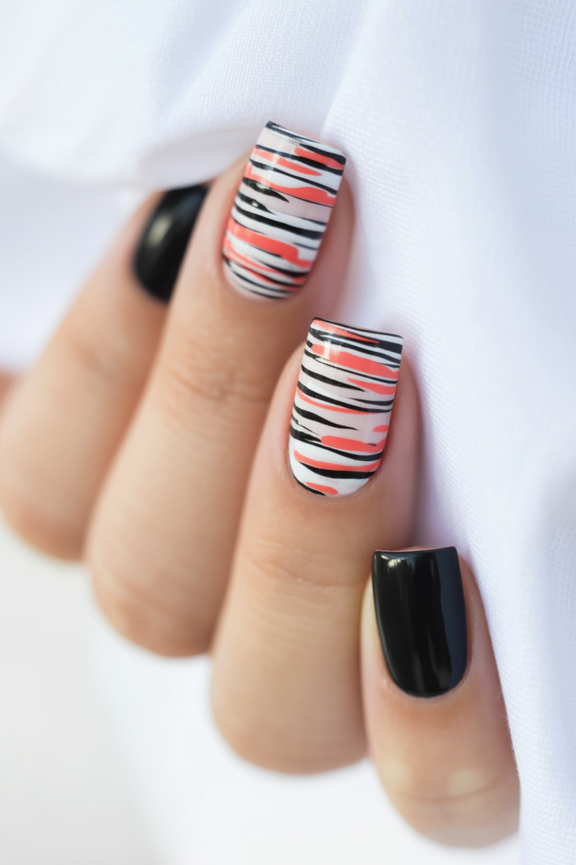 Pairing a couture twist with a black manicure is done by adding two accent nails with coral, white, and black zebra strokes and packed polish. The glossy, smooth, and pointed edges help to exaggerate the elegance and highlight that the zebra strokes are not rough. This looks like a designer clutch moment. It is perfect for a night out or worn as a day’s statement accessory.