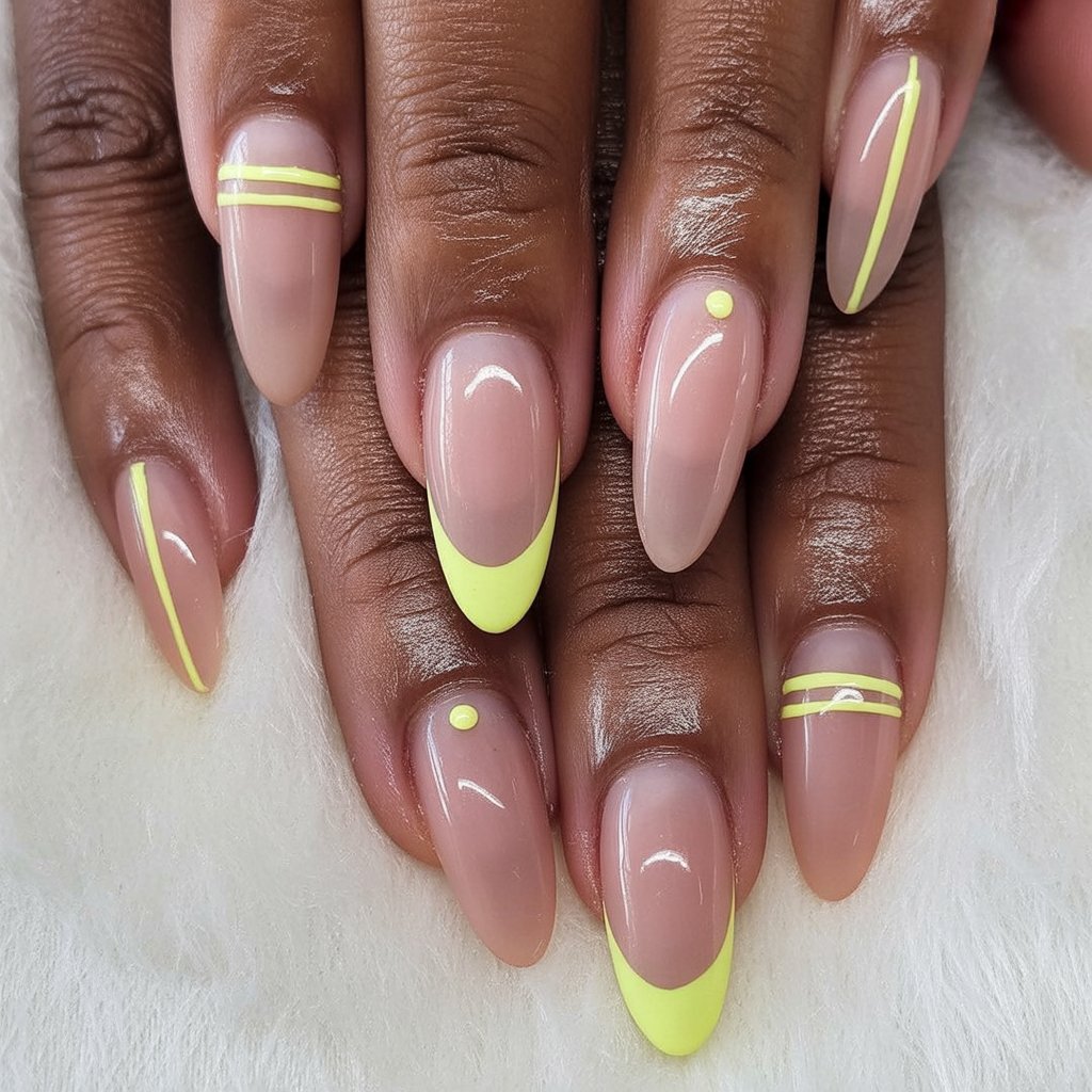 A whisper of highlighter yellow along a nude base turns classic French into something fresh and elegant. The slim lines and tiny dot accents make the nails feel like fine jewelry—delicate, modern, and a little playful. On almond-shaped nails, the proportions are balanced and flattering, elongating the fingers without any fuss. It’s quiet-luxe with a wink, the perfect art moment when you want subtle drama.