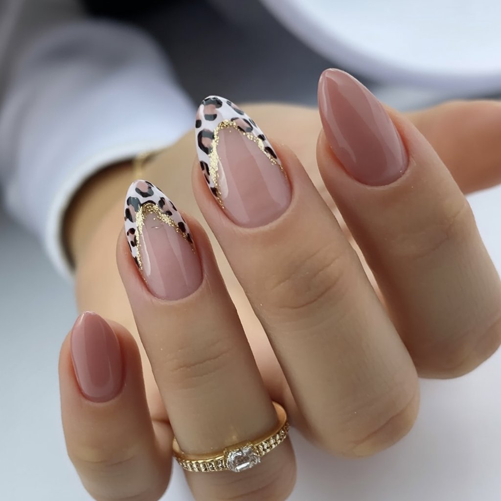 A soft nude base sets the stage for a sleek V-shaped French that swaps white for a chic leopard whisper and a sliver of gold. The effect is elegant rather than loud—like a silk scarf tied just so—bringing a refined aesthetic to the almond shape without stealing the whole show. It’s classy, flirty, and absolutely dinner-date ready, the kind of art detail that reads “designer” even with denim and a blazer.