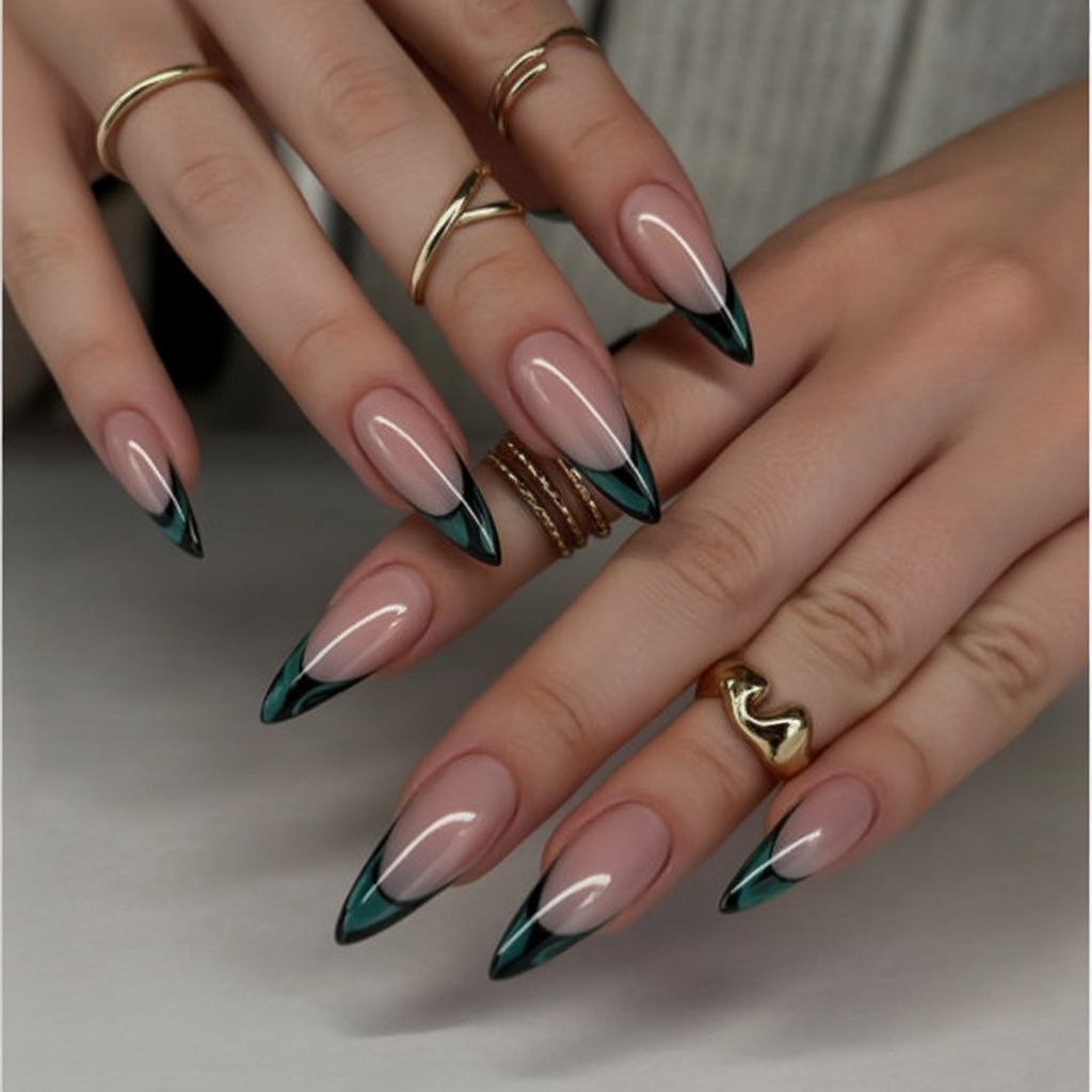 A glassy nude base is finished with inky teal tips that sharpen into a refined edge—mysterious, elegant, and undeniably glamorous. The color shift feels luxurious against gold rings, and the elongated silhouette brings runway drama while staying clean. It’s a sophisticated twist on French that flatters almond and stiletto lovers alike.