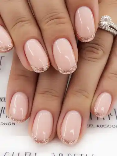Current 2026 trends note that ultra-fine glitter French is the go-to for refined designs. Keep tips thin, following the natural smile line for a clean finish. Works on natural nails or gel extensions if you need extra strength. Pair with gold hoops, neutral colors, and a creamy pink lip for an easy, pulled-together aesthetic.