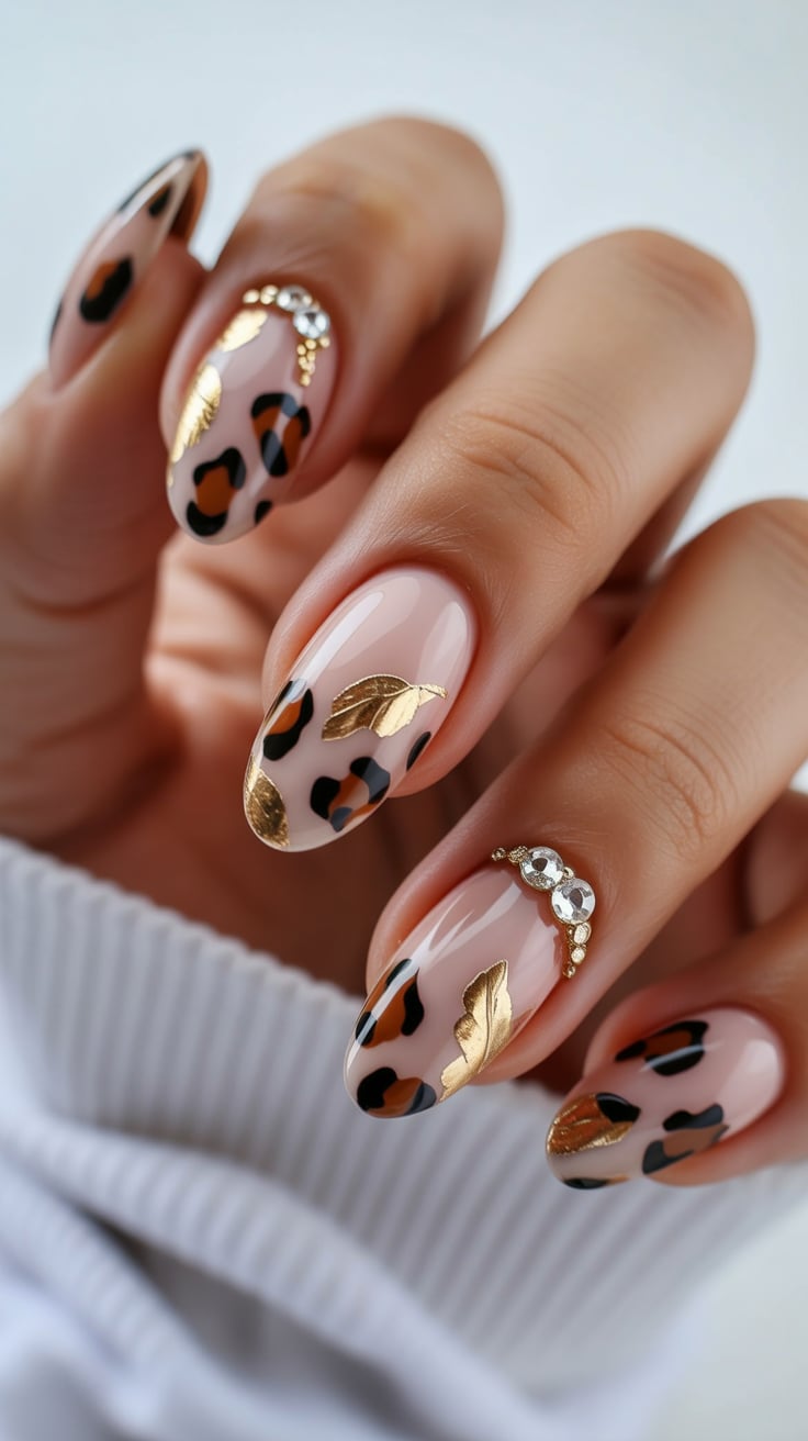 Think of this as the little black dress of animal prints—creamy nude base, airy leopard spots, and brushed gold foils that glow like evening light. The mix reads elegant rather than loud, thanks to negative space and careful placement. A couple of tiny crystals add just enough sparkle to make the whole set feel curated and chic. The result is a refined aesthetic with a hint of wild.