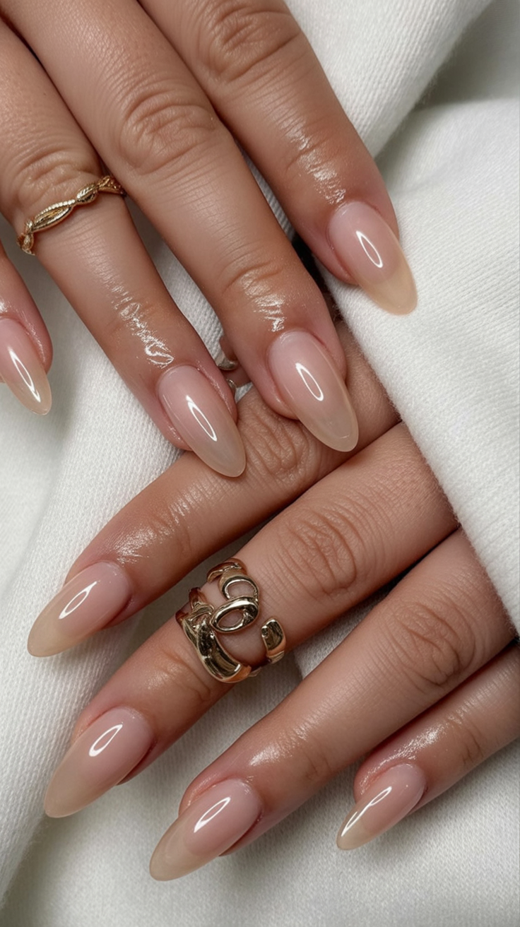 This ultra-sheer nude almond looks like perfected skin—quiet luxury in manicure form. The soft glow and elegant taper elongate the fingers while keeping the look clean and minimal. It’s the go-anywhere choice that makes jewelry pop and outfits feel elevated, embodying the most timeless side of classy nails.