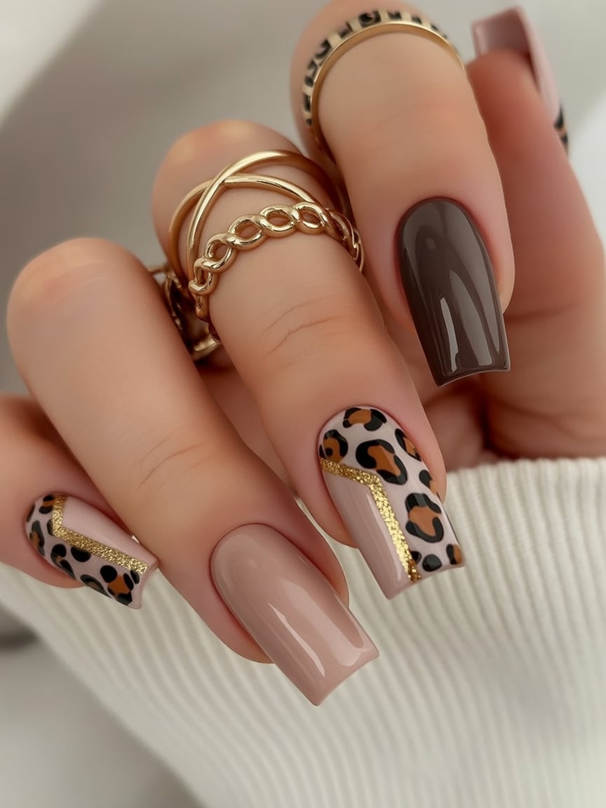 The combination of coffee creams, deep cocoa, and crisp square nail geometry works harmoniously along with leopard accents. The balanced modern design, which is crafted to look like a tailored suit with a playful lining, features gold zigzag cuts that are satin finished to create a juxtaposition of playful and structured. It can be confidently worn to the boardroom, and it keeps the artistry elegant and classy.