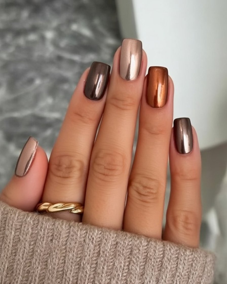 Warm latte, copper, and deep espresso melt across these square nails like a designer capsule wardrobe. The mirror finish catches light without shouting, so the whole set feels elegant and quietly luxe—perfect when you want clean polish that still reads special. It’s the kind of aesthetic that pairs with a silk blouse and a simple gold ring, giving just enough shine to lift the mood. If you love ideas that look expensive without trying, this is your inspo for 2026 trends.