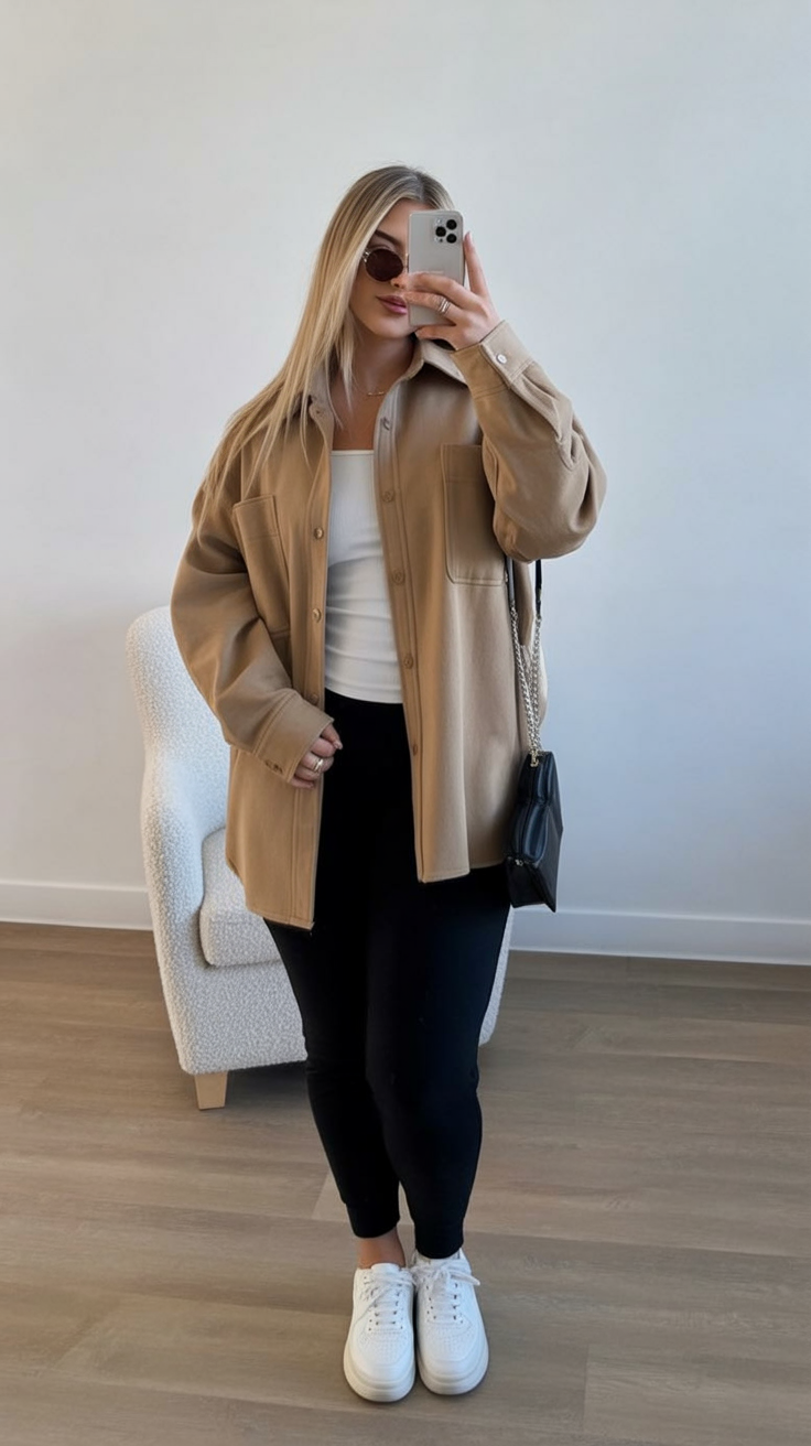 This look is the definition of calm confidence. The neutral overshirt feels structured and polished, but it still has that relaxed, wearable vibe that makes cold spring days feel easy. With leggings and sneakers, it’s practical, clean, and modern—like you’re not trying to impress anyone, but you still absolutely could.