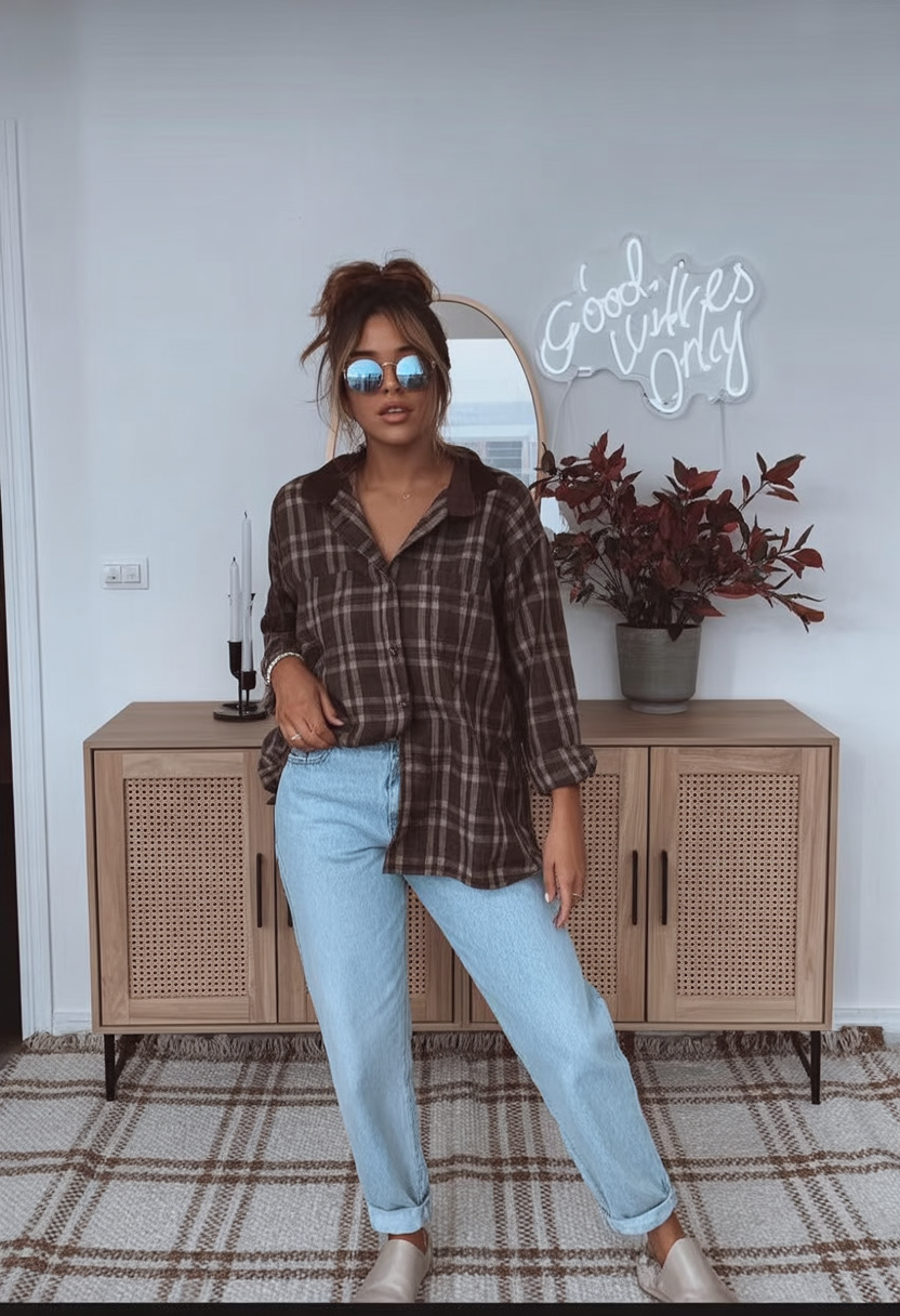 Styling tip: to keep this from feeling too “borrowed from the boys,” focus on shape. Half-tuck the shirt, push the sleeves up, and add a slim belt if you want definition. This is great with casual jeans and flat shoes for a rainy day commute, but it can also go more dressy with a sleek bun and bold earrings. If you’re craving that Europe-inspired relaxed look, stick to neutral accessories and let the plaid do the talking.