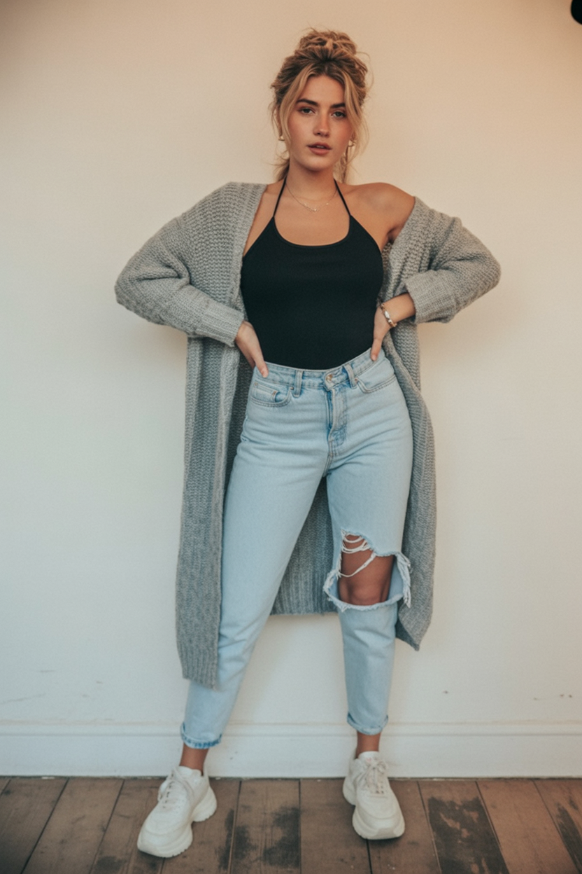 Styling tip: keep the base clean and fitted so the cardigan can be big and cozy without overwhelming you. This is a perfect rainy-day outfit—swap to water-resistant shoes if needed, or add a trench coat for extra coverage. If you want a more polished version, switch the jeans to darker casual rainy-day jeans and add simple gold jewelry for a subtle work-casual finish.